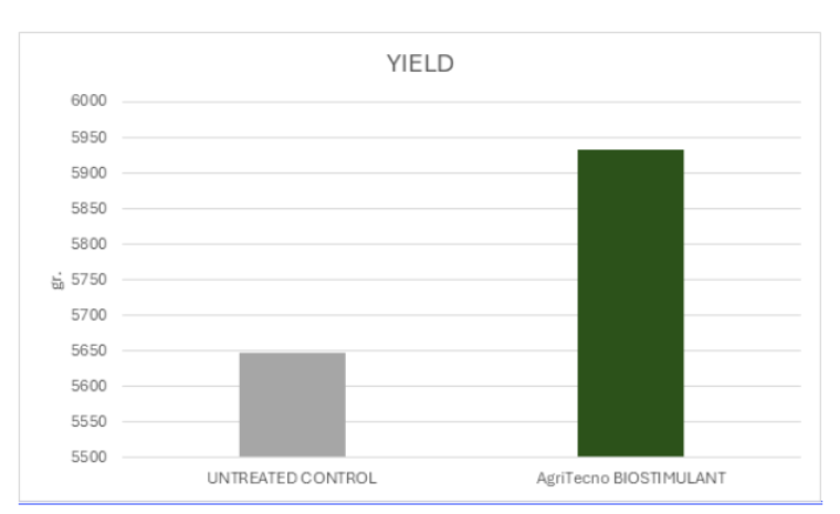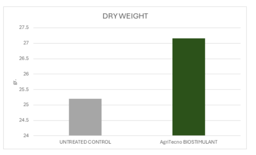 In this trial, two foliar applications were carried out during the crop cycle, beginning seven days after transplanting. At maturity, dry weight was measured—an essential indicator of metabolic performance. With the AgriTecno biostimulant, an 8% increase in dry weight was achieved, reflecting greater carbohydrate synthesis and structural biomass.